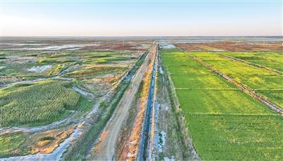 夕阳西下,修整好的茭白田熠熠生辉,曾经白花花的盐碱地如今变成了金灿灿的沃野。小小的茭白,正以改良土壤的方式促进镇赉县生态修复,推进乡村全面振兴。(本报记者 孟海鹰)