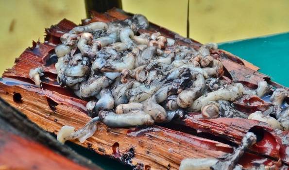 吃之前也要稍微做一下处理,比如清除树虫的头部脚部以及它们腹中的食物,然后调制一下混合柠檬汁、醋和盐巴的调料,也可以再加一些辣椒提味。